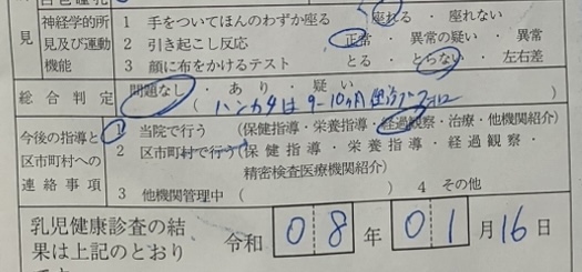総合判定:問題なし(ハンカチは9~10ヶ月検診でフォロー)