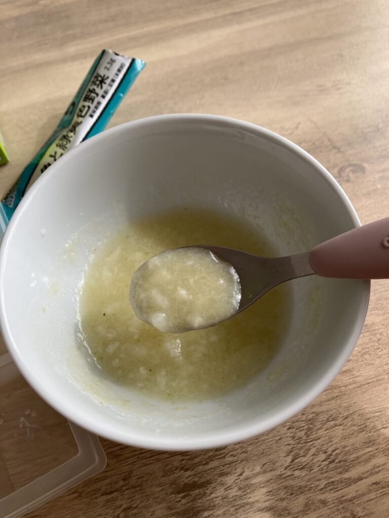 和光堂の「白身魚と緑黄色野菜」のスティック1本を白がゆの中へ。