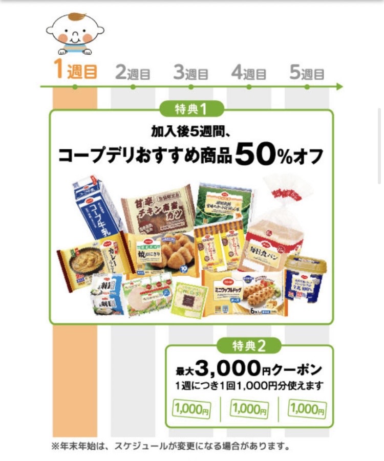 加入後5週間限定で50%オフ商品があります。