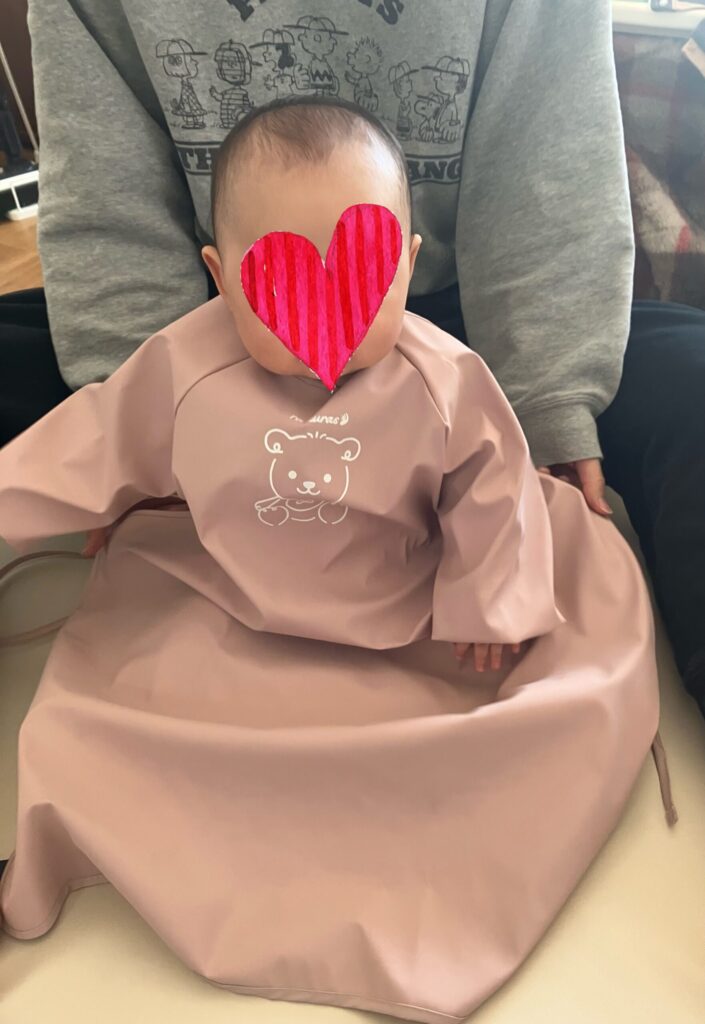 つかみ食べで活躍するという噂のお食事エプロンを装着。