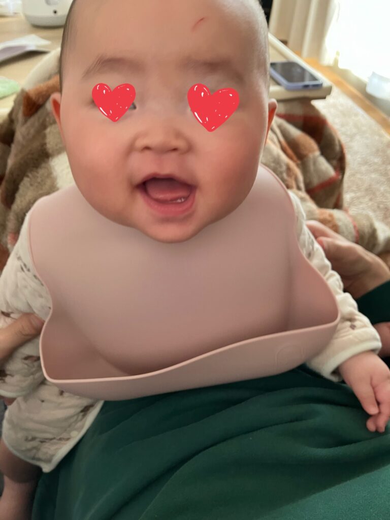 でもこのお食事エプロン、食べこぼしをしっかりキャッチしてくれて助かる!