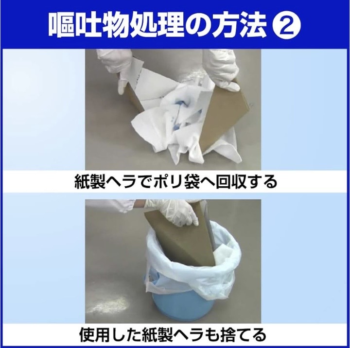 このあと、高吸収シートを嘔吐した場所に置いて、その上から除菌漂白剤をまく必要があります。