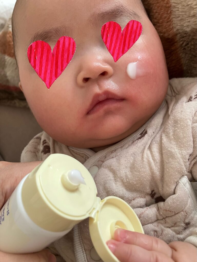 七夕ちゃんの顔を濡れコットンで拭いて、乳液をたっぷり塗ります。